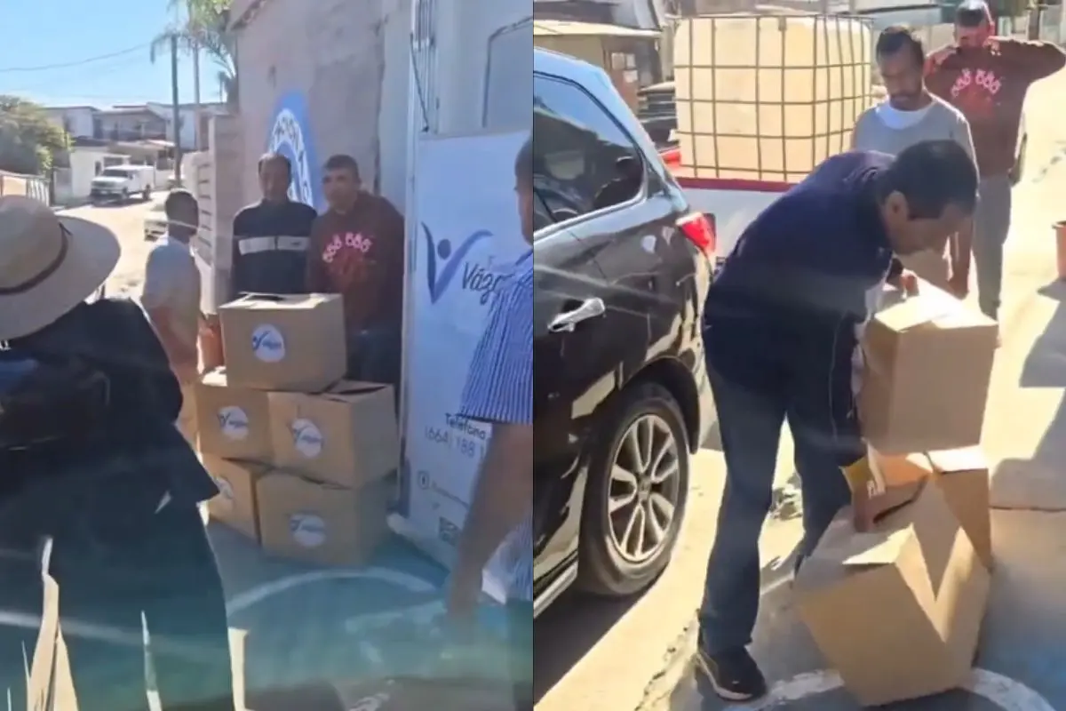 En el video, grabado en lo que parece ser una colonia de Tijuana, se ve al diputado acompañado de una mujer que toma fotos a tres hombres junto a cinco cajas vacías, colocadas frente a la lona con el logo de la fundación.