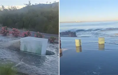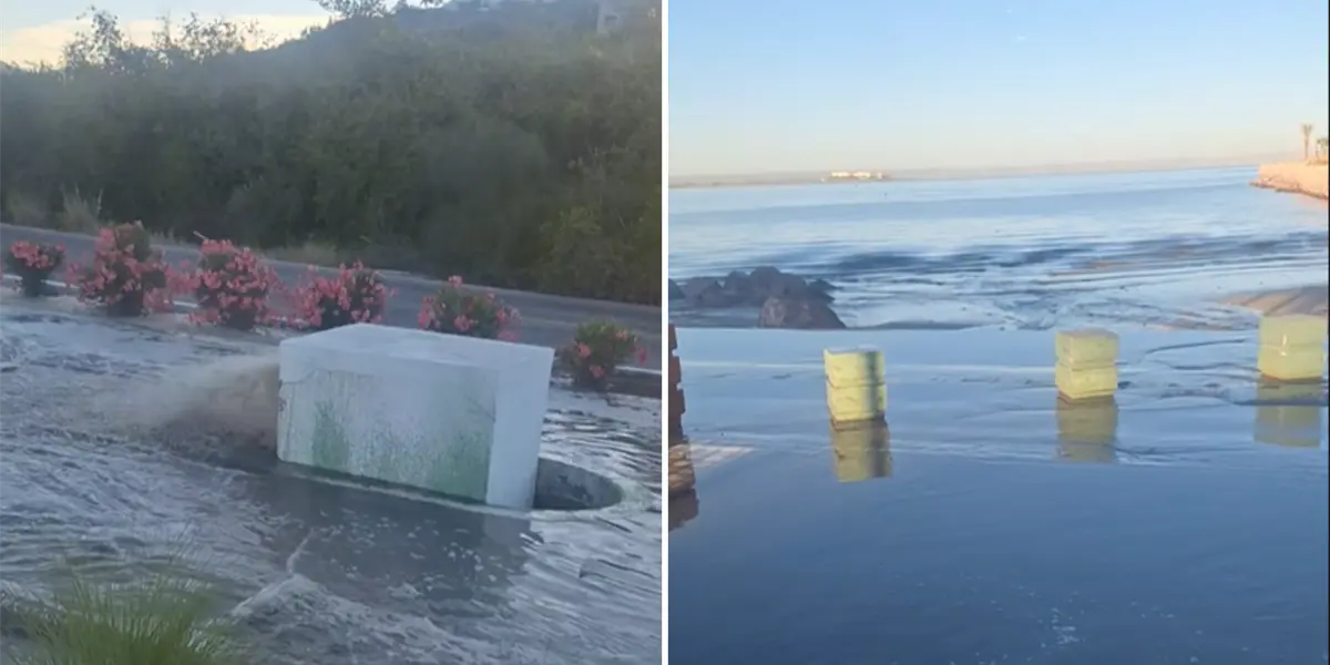 En las imágenes captadas por ciudadanos se observa cómo el agua residual brota con fuerza desde una estructura de concreto y corre cuesta abajo hasta llegar al mar, formando un flujo denso y oscuro que se dispersa con la marea.