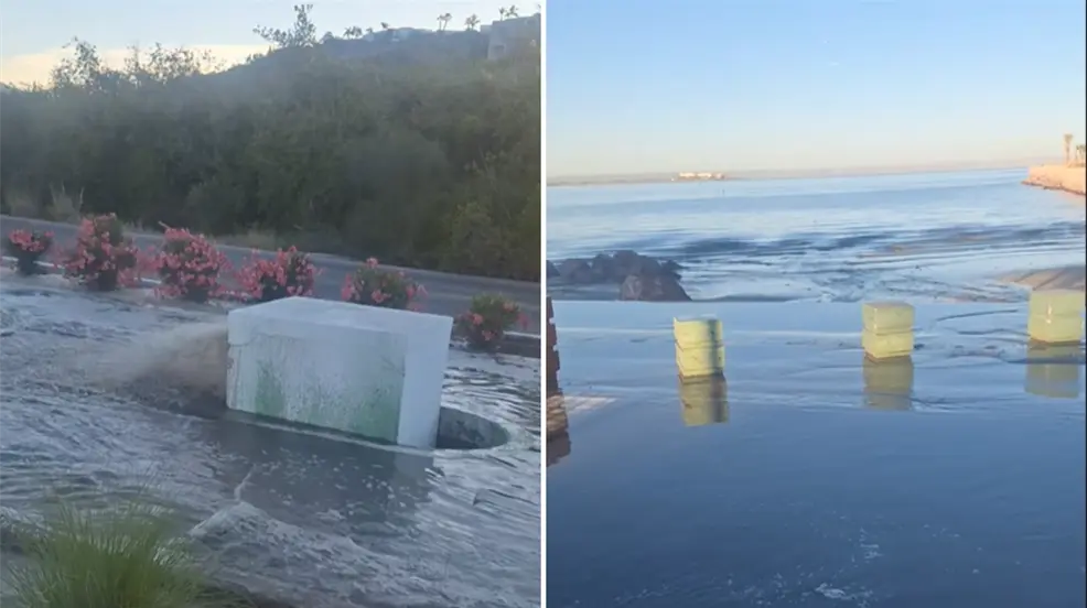 Fuga de aguas negras llega al mar frente al hotel Araiza en el malecón de La Paz