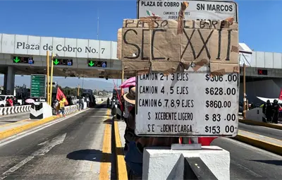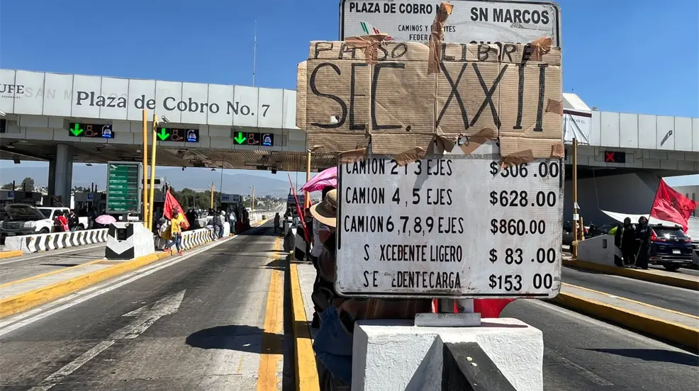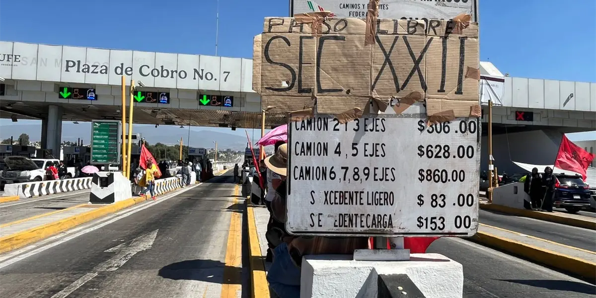 Integrantes de la Coordinadora Nacional de Trabajadores de la Educación (CNTE) tomaron la plaza de cobro número 7, conocida como la caseta de San Marcos, ubicada en la autopista México–Puebla, como parte de su jornada de movilizaciones.