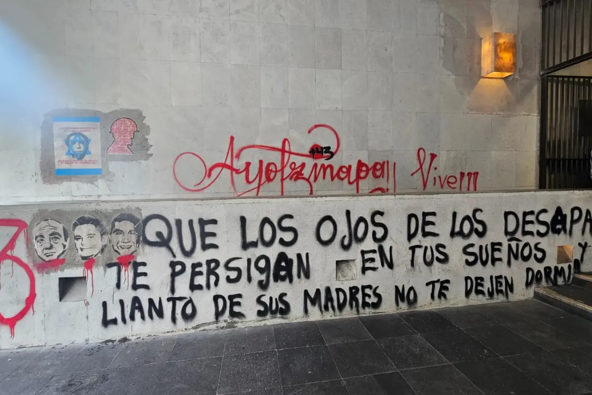 Durante la protesta, un grupo de normalistas realizó pintas en la fachada de la Secretaría de Relaciones Exteriores (SRE), ubicada en el Centro Histórico.