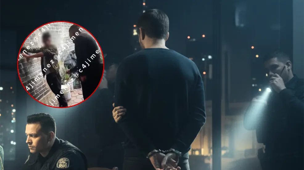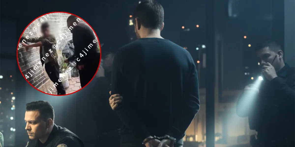Imagen de referencia del arresto de uno de los posibles implicados en el asesinato de un supuesto extorsionador en CDMX, e imagen de uno de los vídeos donde este golpeaba y amenazaba a las víctimas. | Gemini IA | Carlos Jiménez (X @c4jimenez)