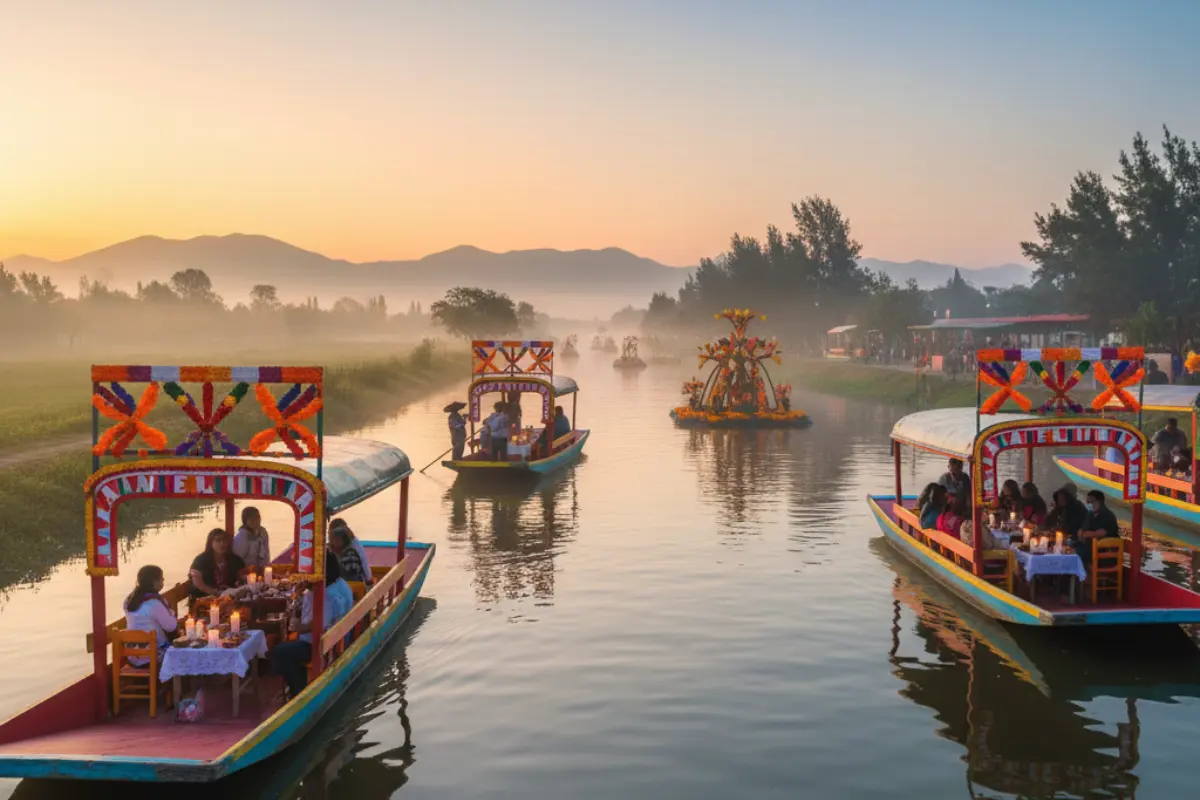 El recorrido comienza de madrugada, cuando el sol apenas ilumina las aguas de Xochimilco con tonos naranjas y violetas. Ese paisaje se convierte en el marco perfecto para presenciar un homenaje a nuestras raíces, donde se entrelazan ritualidad, magia y reflexión.