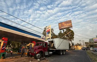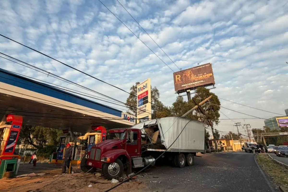 FOTOS | Camión con madera choca en Naucalpan; poste evita tragedia cerca de gasolinera