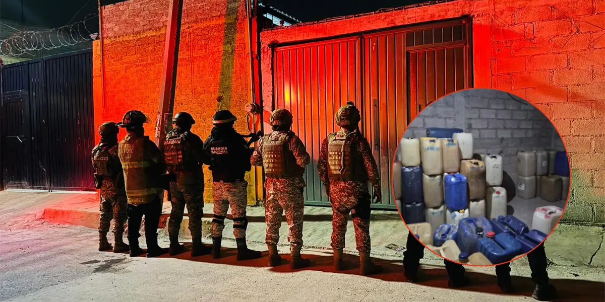 En el interior ubicaron una toma clandestina de huachicol, bidones vacíos y llenos de 20 y 50 litros, además de mangueras con diversas conexiones a una toma clandestina.