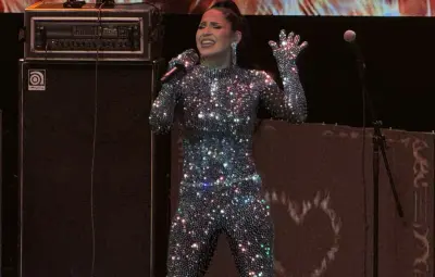 Ataviada con un vestuario repleto de lentejuelas, la artista también deleitó a la audiencia con el cover de “Costumbres” de Rocío Dúrcal y el momento romántico fue cuando una pareja se comprometió en “Hasta el fin del Mundo”.