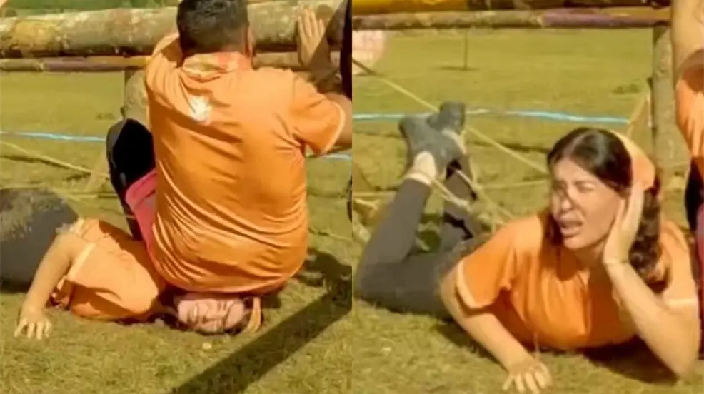 Durante el desafío, la joven cayó al suelo, pero la situación empeoró cuando otro competidor, identificado como Teo, cayó sobre su cabeza.