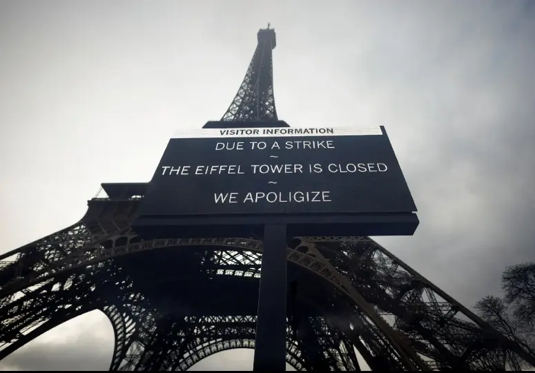 El 27 de diciembre de 2023, la Torre Eiffel cerró sus puertas a los visitantes debido a una huelga de empleados en medio de las negociaciones contractuales. El cierre coincidió con el día en que el monumento parisino conmemora el centenario de la muerte de su creador, Gustave Eiffel.