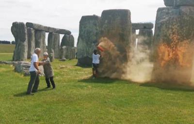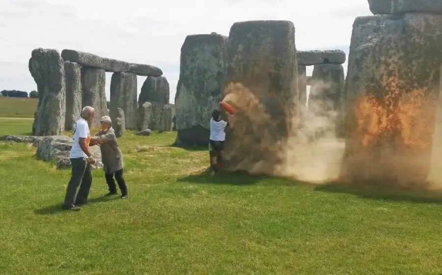 Activistas climáticos rociaron el icónico monumento de piedra con una sustancia naranja, provocando la intervención de la policía.