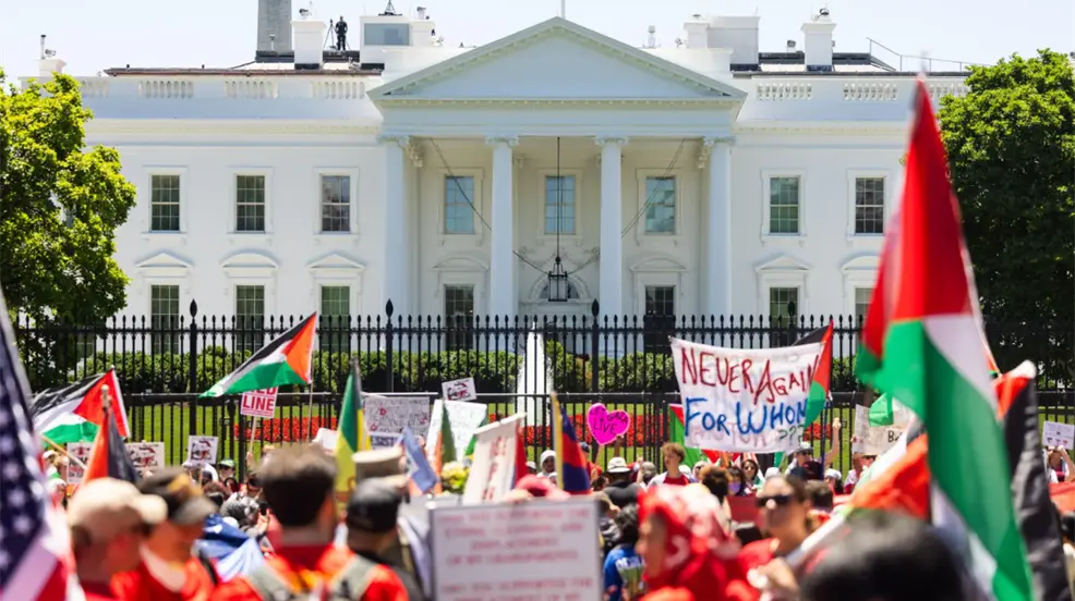 Manifestantes rodean la Casa Blanca con pancarta roja en protesta propalestina