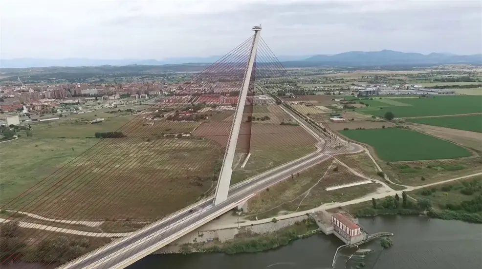 Este puente cruza el río Tajo y tiene una longitud total de 730 metros, con un vano principal de 318 metros sostenido por cables anclados a una torre central, que es el elemento más llamativo de la estructura.