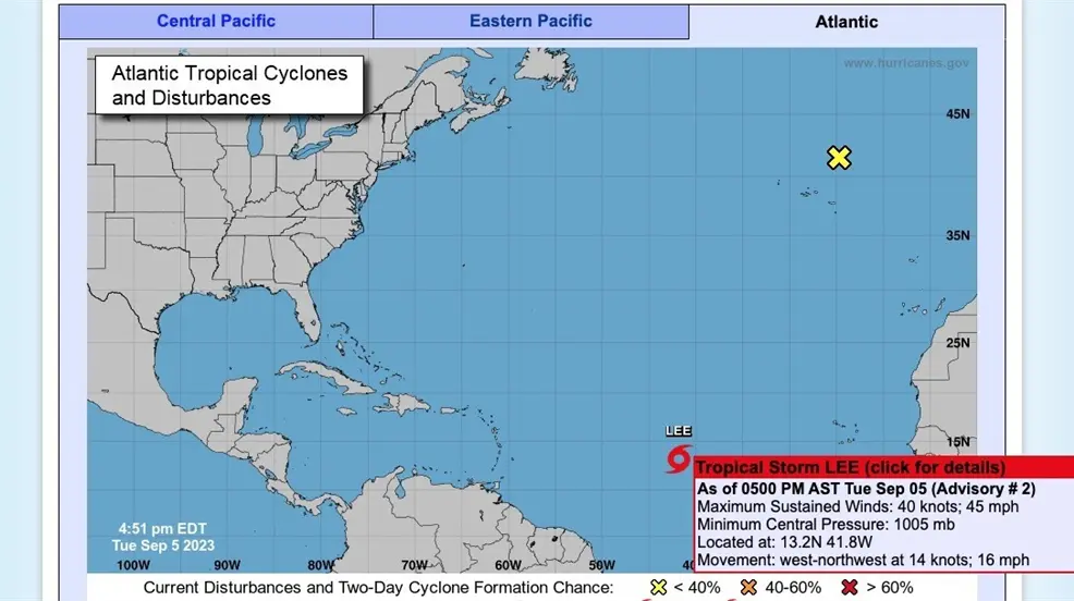 ESTADOS UNIDOS.- La tormenta tropical Lee se ha formado en el Océano Atlántico el pasado martes, y los meteorólogos predicen que se fortalecerá hasta convertirse en un huracán de categoría 3 o superior a medida que se acerque al Caribe. Actualmente, la tormenta se encuentra a aproximadamente 2.115 kilómetros al este de las Antillas Menores, con vientos máximos sostenidos de 75 km/h y una velocidad de desplazamiento hacia el oeste-noroeste de 26 km/h, según informó el Centro Nacional de Huracanes de Estados Unidos.