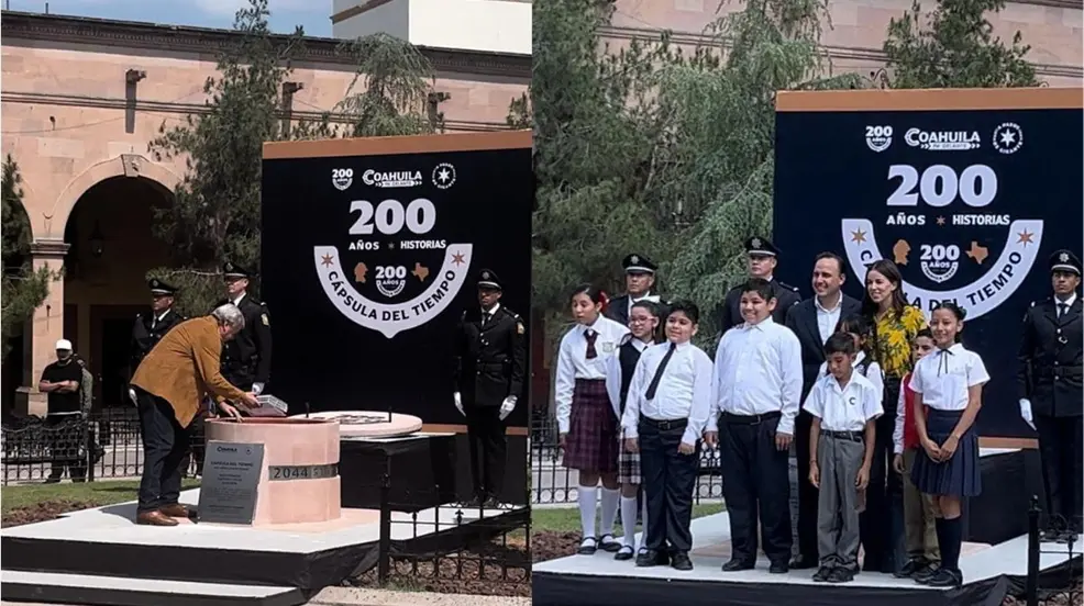 SALTILLO, Coahuila.- En el marco de las celebraciones por el bicentenario de la fundación de Coahuila y Texas, el gobernador del estado, Manolo Jiménez Salinas, lideró una ceremonia histórica en la Plaza de Armas de Saltillo junto a los alcaldes de los 38 municipios de la entidad. En este evento especial, se realizó el depósito de una cápsula del tiempo titulada '200 años, 200 Historias', la cual será testimonio de la vida y cultura coahuilense para las futuras generaciones.