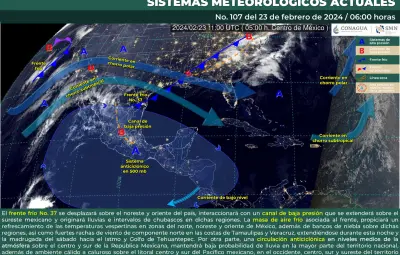 CIUDAD DE MÉXICO.- Este viernes 23 de febrero, el frente frío no. 37 se desplazará sobre el noreste y oriente de México, cuya interacción con un canal de baja presión, el cual se extenderá sobre el sureste del país, originará lluvias e intervalos de chubascos en dichas regiones.