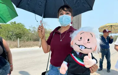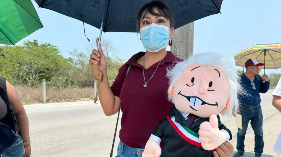 Abigail soporta altas temperaturas para que AMLO le firme un peluche