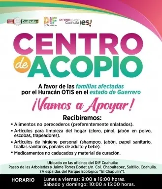 SALTILLO, Coahuila de Zaragoza. El director General de DIF Coahuila, Roberto Cárdenas Zavala, informó que por instrucciones del gobernador Miguel Ángel Riquelme Solís estarán en operación a partir de este viernes 27 de octubre centros de acopio en diferentes puntos de Saltillo para apoyar a las personas daminificadas en el Estado de Guerrero por los efectos del Huracán Otis.