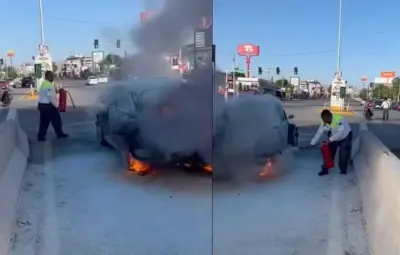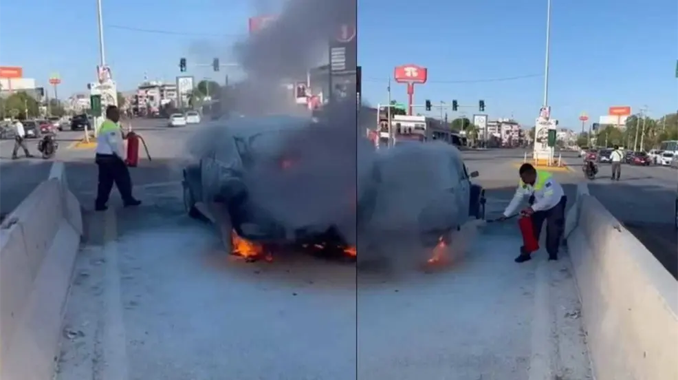 GÓMEZ PALACIO, Durango.- Una persona de la tercera edad fue auxiliada de manera oportuna por miembros de Tránsito y Vialidad del Municipio de Gómez Palacio, ya que el automóvil donde viajaba sufrió un desperfecto y comenzó a incendiarse.