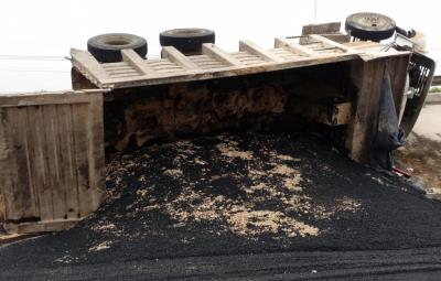 Un volquete cargado con material para pavimentar termino volcado luego que el chofer dormitara