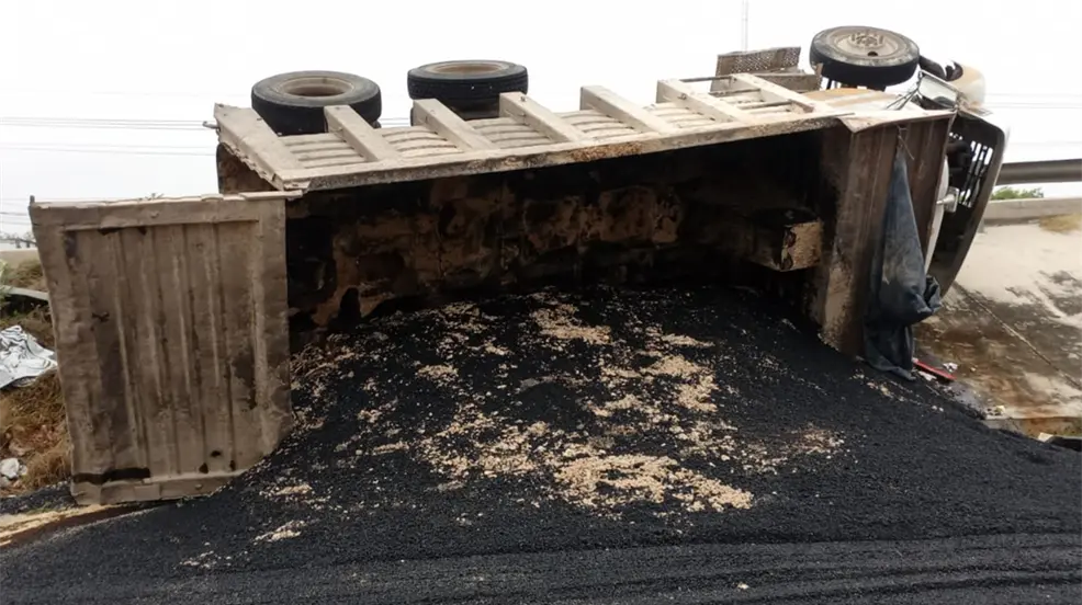 El operador del volquete, que transitaba de oriente a poniente, aparentemente dormitó mientras conducía, lo que le hizo perder el control del vehículo y dirigirlo hacia la derecha, provocando la volcadura. El impacto fue tal que el camión quedó volcado sobre su costado, esparciendo la carga destinada para pavimentación.