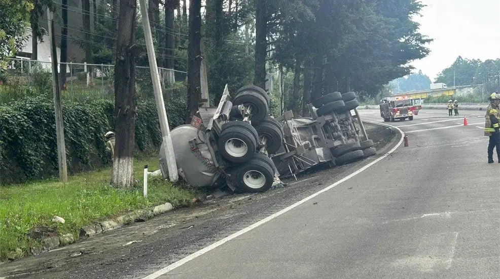 OCOYOACAC, Estado de México.- Al mediodía de este viernes, se ha reportado un accidente grave en la carretera México-Toluca, dirección Lerma, específicamente en el Km 48, cerca de la Caseta de Lerma. Una pipa con doble remolque que transportaba gasolina se volcó, presentando una pequeña fuga por posición y no por fisura. Esto ha obligado al cierre de los carriles correspondientes en el tramo de La Escondida, en Ocoyoacac, Estado de México.