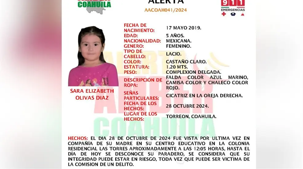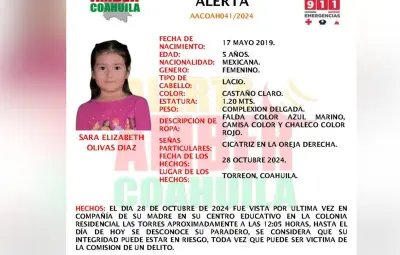 Las autoridades de Coahuila activaron una Alerta Amber para localizar a Sara Elizabeth Olivas Diaz, de 5 años, desaparecida el 28 de octubre en Torreón.