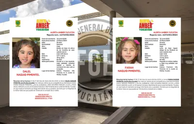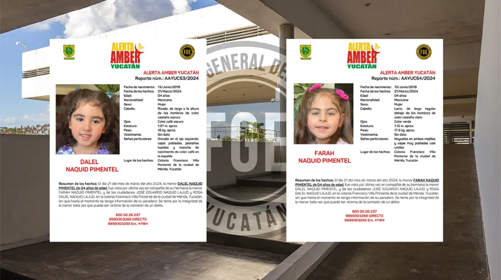 MÉRIDA, Yucatán.- La noche de este 30 de marzo, la Fiscalía General del Estado (FGE) informó sobre la activación de una Alerta Amber, solicitando el apoyo para la búsqueda y localización de las menores de edad, Dalel y Farah, de apellidos Naquid Pimentel, ambas de 4 años de edad.