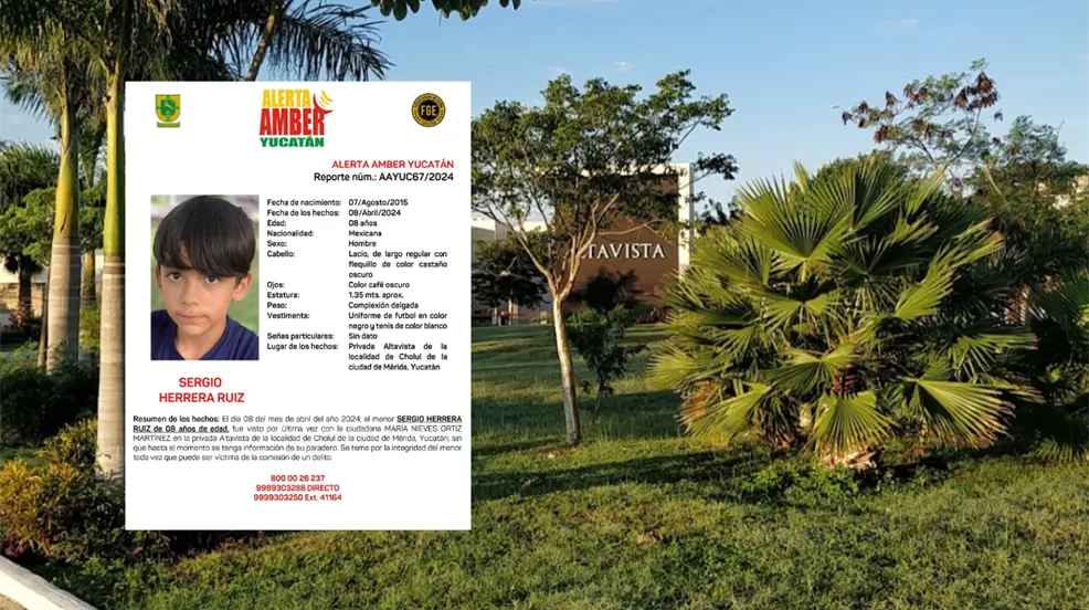 MÉRIDA, Yucatán.- Este sábado se activó la Alerta Amber por la desaparición de un niño de 8 años, identificado como Sergio Herrera Ruiz, así lo informó la Fiscalía General de Yucatán, para solicitar el apoyo para la búsqueda y localización del menor.