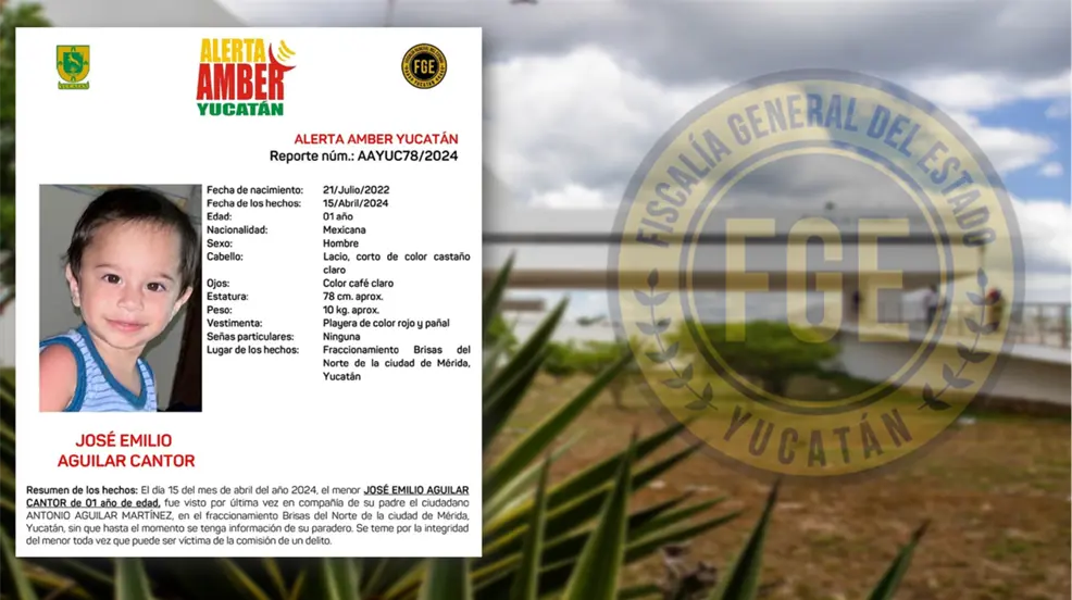 MÉRIDA, Yucatán.- La Fiscalía General del Estado (FGE) de Yucatán ha activado una Alerta Amber con el fin de localizar a José Emilio Aguilar Cantor, un niño de solo un año de edad, quien desapareció el pasado 15 de abril en el fraccionamiento Brisas del Norte, en Mérida. Según los reportes, el menor fue visto por última vez en compañía de su padre, Antonio Aguilar Martínez, lo que ha llevado a la Fiscalía a iniciar una investigación exhaustiva sobre el caso.