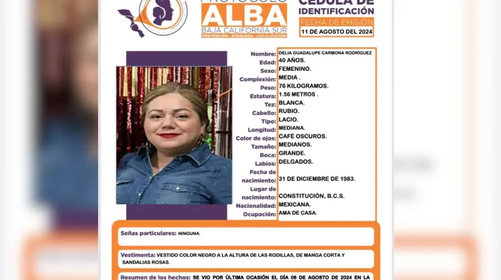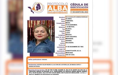 LA PAZ, Baja California Sur.- La Procuraduría General de Justicia del Estado de Baja California Sur (PGJE BCS) ha activado el Protocolo Alba para la localización de Delia Guadalupe, una mujer de 40 años que desapareció en la Heroica Mulegé.