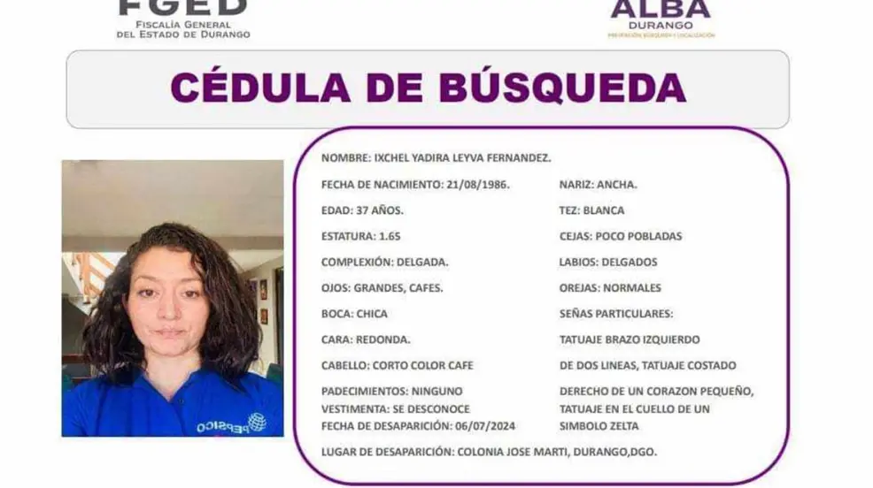 DURANGO, Durango.- Activan protocolo Ambar, para encontrar a Ixchel Yadira Leyva quien fue vista por última vez en la colonia José Martí en la capital del estado.