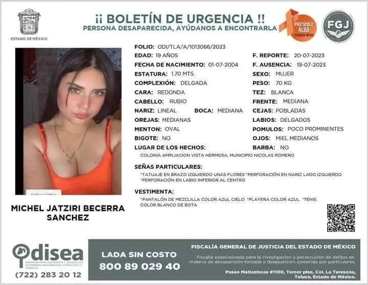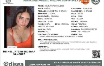NICOLÁS ROMERO, Estado de México.- Familiares de Michel Jatziri Becerra, de 19 años, quien desapareció el pasado 19 de julio, tras salir del centro comercial Town Center de Nicolás Romero, acusaron que la plaza tuvo muy poca disposición, al igual que las autoridades locales para mostrar de forma oportuna las imágenes de cámaras de seguridad y del C-5.