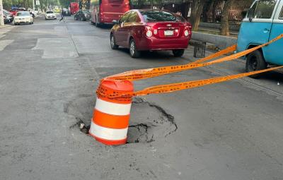 MIGUEL HIDALGO, Ciudad de México.- Desde hace una semana, un pequeño agujero comenzó a formarse en una vialidad principal junto a la Escuela Superior de Comercio y Administración (ESCA), Santo Tomás, hoy 12 de junio se ha convertido en un socavón.