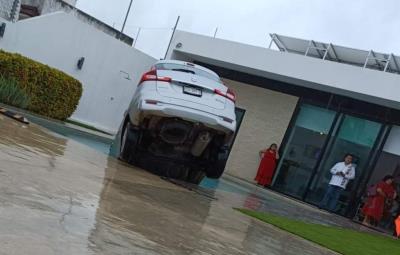 El hecho ocurrió alrededor del mediodía de este sábado, cuando el conductor de una Suzuki Ertiga llegó al salón y cuando intentaba estacionarse, no se dio cuenta de que la alberca estaba cerca, por lo que la parte delantera de la unidad terminó sumergida y con las llantas traseras al aire.