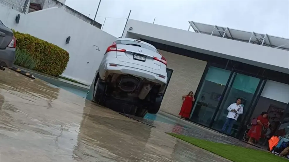 ¡Al agua! Camioneta cae a una piscina en una sala de fiestas en Mérida