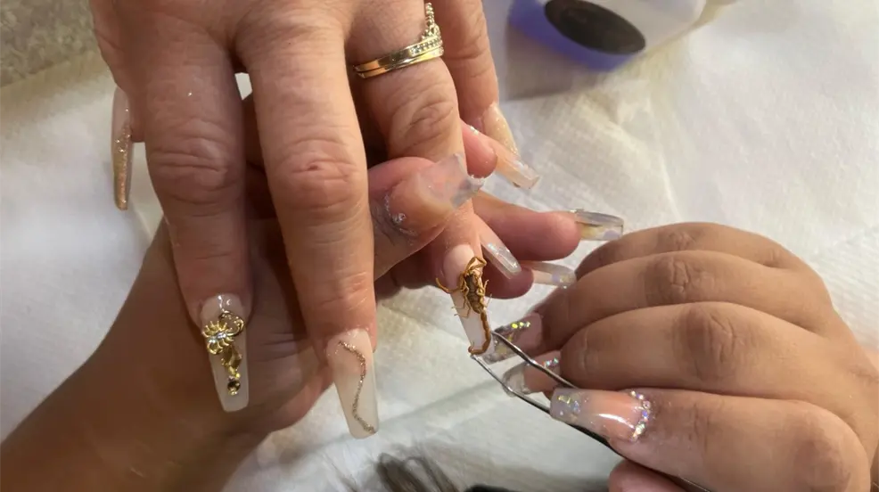 Existe en la capital una emprendedora que ha llevado su creatividad a generar diseños para añadir alacranes reales a sus modelos de uñas, la técnica es prácticamente igual a la cualquier aplicación, después de alargar las uñas, se pega un alacrán diminuto hasta darle una forma original para luego encapsularlo con material de acrílico.