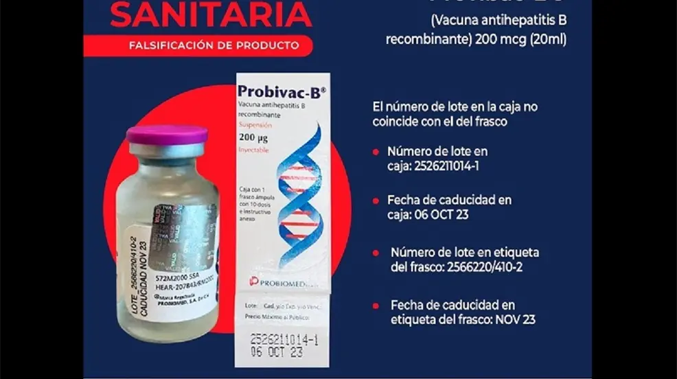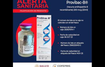 La Cofepris emitió una alerta sanitaria por la falsificación de Provibac-B, vacuna antihepatitis B recombinante.