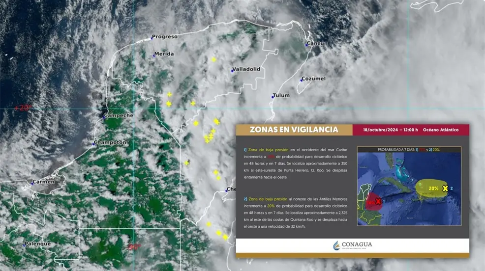 Durante el periodo del 18 al 20 de octubre, se prevé la presencia de lluvias fuertes a intensas, especialmente en los municipios del oriente, centro y sur del Estado. Las condiciones climáticas en el Mar Caribe occidental, particularmente en su noroeste, también están asociadas con un aumento en la actividad de lluvias y tormentas eléctricas, relacionadas con este mismo sistema de baja presión.