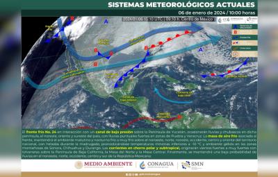 Se anticipa la presencia de vientos muy fuertes a intensos con tolvaneras en varias zonas, siendo Baja California, Sonora, Chihuahua y Durango las más afectadas, con rachas que podrían superar los 100 km/h. Además, se espera la ocurrencia de chubascos y lluvias fuertes, acompañadas de un marcado descenso de las temperaturas, con mínimas que podrían llegar a ser inferiores a -10 °C en áreas montañosas de Sonora, Chihuahua y Durango. La posibilidad de caída de nieve o aguanieve se mantiene, extendiéndose hacia otras zonas durante la madrugada del lunes.