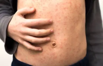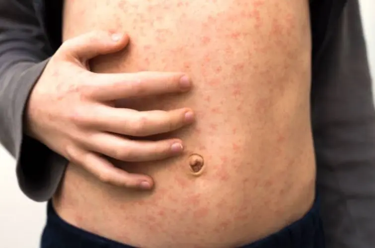 La enfermedad se caracteriza por un cuadro inicial parecido al de un catarro con fiebre, tos, estornudos, lagrimeo y congestión nasal, a lo que sigue unos días después la aparición de ronchas rojas pequeñas en la piel.