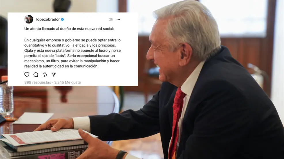 "Un atento llamado al dueño de esta nueva red social: Ojalá esta nueva plataforma no apueste al lucro y no se permita el uso de "bots", escribió López Obrador en su primer mensaje en Threads.