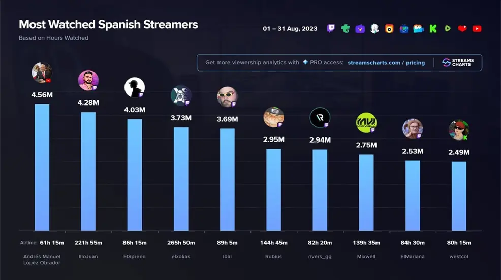 Aunque AMLO no es un streamer como tal, su tradicional conferencia matutina es una transmisión recurrente en su canal de Yotube por lo que Streams Chart lo mide junto a otros realizadores como Illo Juan, quien obtuvo el segundo lugar; el argentino Spreen, que obtuvo el tercero; Joaquín Domínguez, conocido como Xokas o “El Xokas” que obtuvo el cuarto e Ibai Llanos, quien cayó hasta el quinto lugar.