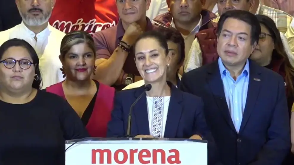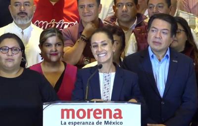 Claudia Sheinbaum estuvo acompañada de Mario Delgado, presidente de Movimiento de Regeneración Nacional (MORENA), quien respondió a cuestionamientos respecto al Instituto Nacional Electoral (INE) y la entrega del bastón de mando por parte del presidente de México, Andrés Manuel López Obrador.