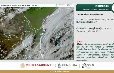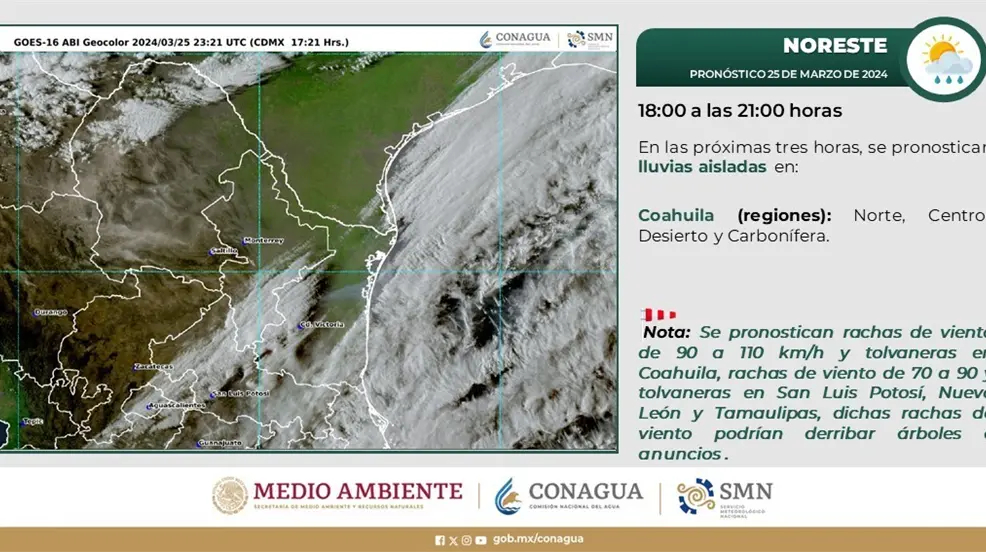 Según el comunicado, se pronostican lluvias aisladas en la región, acompañadas de vientos con ráfagas de 90 a 110 km/h y tolvaneras en el estado de Coahuila. Asimismo, se espera la presencia de ráfagas de viento que podrían alcanzar velocidades de 70 a 90 km/h, también con posibles tolvaneras, en los estados de San Luis Potosí, Nuevo León y Tamaulipas.