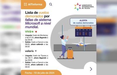 TOLUCA, Estado de México.– El Aeropuerto Internacional de Toluca (AIT) también se vio afectado por un masivo apagón informático a nivel mundial, lo que llevó a la suspensión de sus operaciones programadas para hoy viernes.