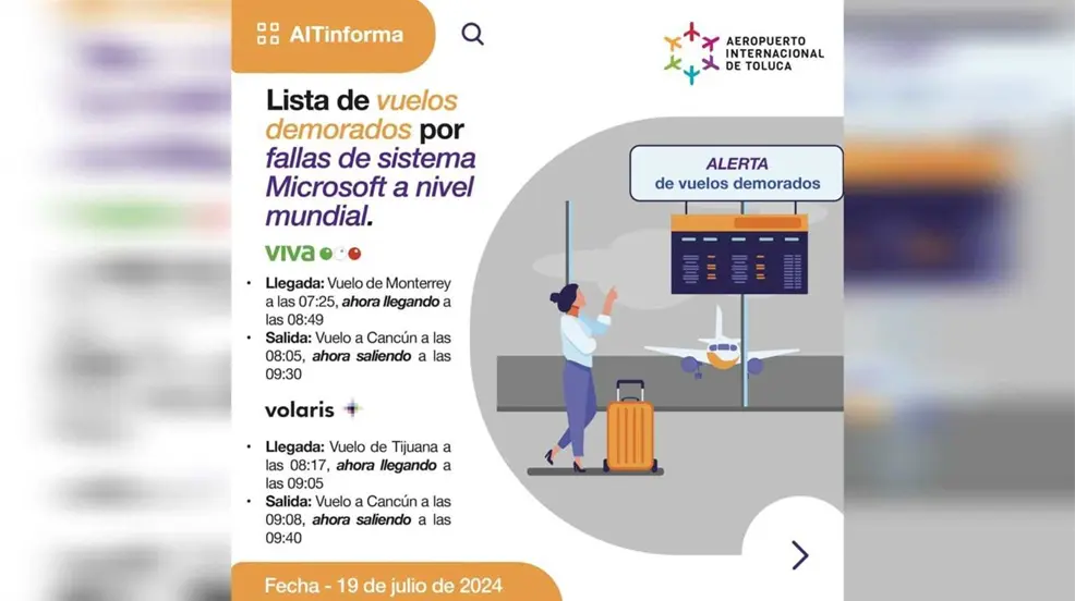 La interrupción, causada por problemas en el sistema operativo Microsoft que afectaron a usuarios globales, incluyó a aerolíneas importantes como Viva Aerobús, que opera vuelos desde Toluca hacia destinos clave como Monterrey, Cancún, Mérida y Guadalajara. Viva Aerobús fue uno de los afectados por la falla en los sistemas informáticos.
