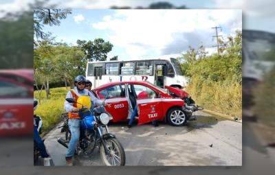 El choque entre un taxi y un autobús de pasajeros causó que tres personas terminaran lesionadas, así como cuantiosos daños materiales