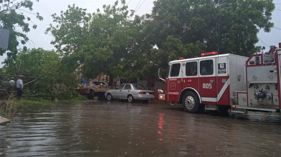 Debido al fuerte temporal que azotó la tarde de este domingo en Mérida, un árbol terminó dañando autos y parte del alumbrado de Ciudad Caucel