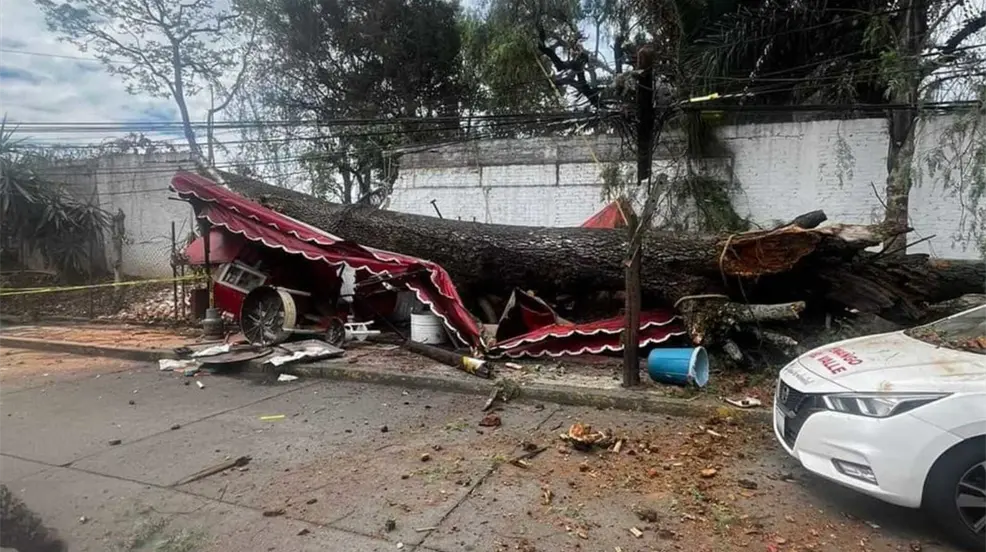 Afortunadamente, no se reportaron heridos entre los clientes ni los comerciantes, pero el negocio sufrió daños materiales significativos. Testigos del suceso describieron cómo el árbol, presuntamente debilitado por las condiciones climáticas y su antigüedad, cayó de manera abrupta sobre la estructura metálica del puesto, dejándola completamente destrozada.