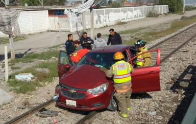 RAMOS ARIZPE, Coahuila- En la tarde de este sábado, un vehículo Chevrolet fue arrastrado por un tren en las vías ferrocarrileras de la carretera estatal Los Pinos, en Ramos Arizpe.