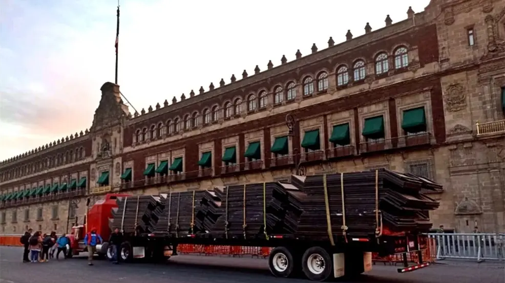 CIUDAD DE MÉXICO, México.- Camiones con docenas de vallas metálicas de tres metros llegaron a Palacio Nacional para protegerlo ante las manifestaciones que se llevarán a cabo el 8 de marzo, el día Internacional de la Mujer.